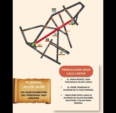 Untuk menjaga kelancaran acara, Dinas Perhubungan Kota Semarang bersama Satlantas Polrestabes Semarang akan menerapkan rekayasa lalu lintas mulai pukul 12.00 WIB hingga acara selesai. Pembatasan arus dimulai dari kawasan Simpang Gendingan, kemudian diperluas ke Jalan Gajahmada hingga Kauman saat kirab memasuki pusat kota.